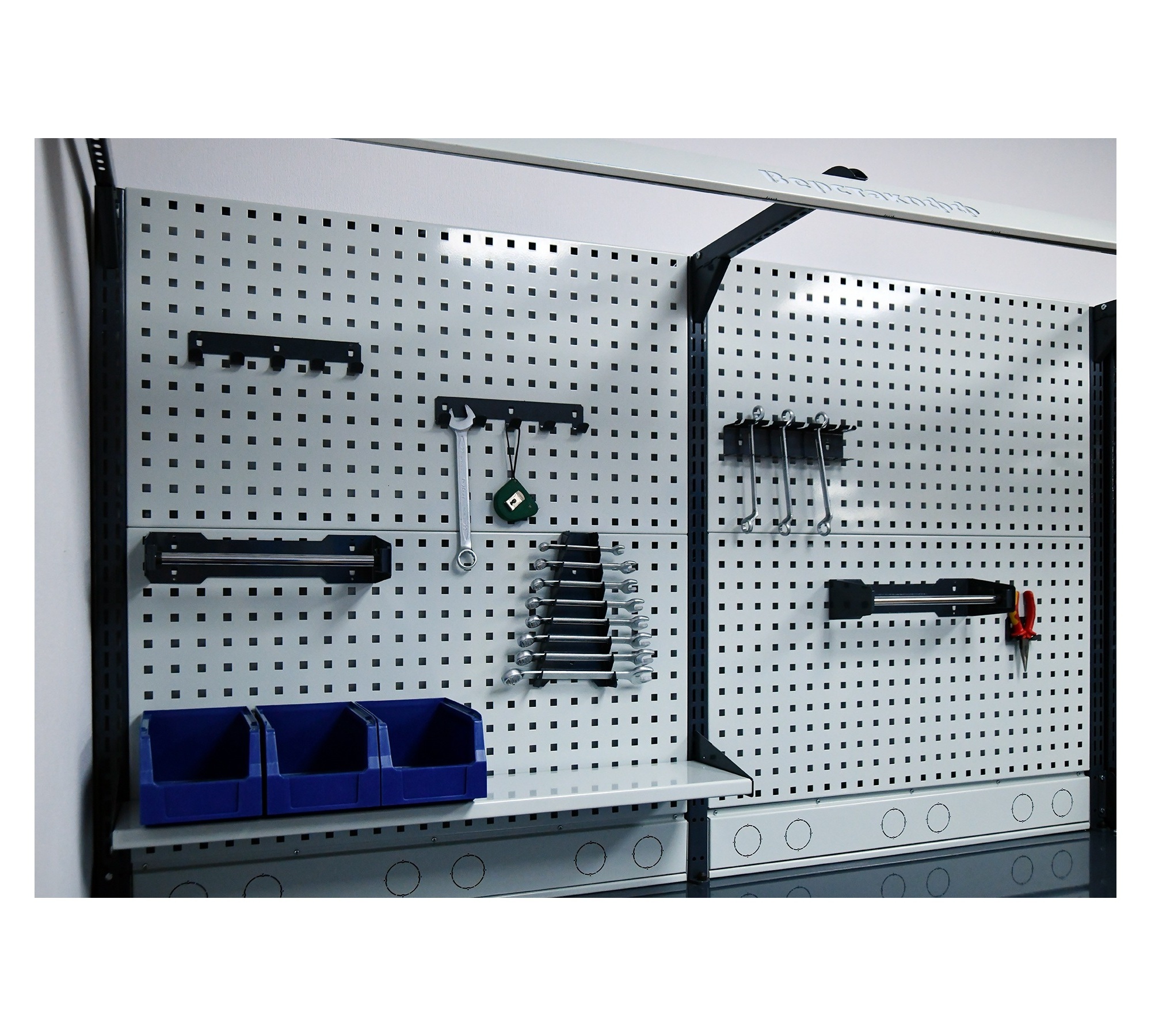 - Рабочее место комплектуется двойным перфорированным экраном, на котором удобно размещать держатели для инструментов, полки и другие навесные элементы, благодаря чему весь необходимый инвентарь всегда будет на виду.